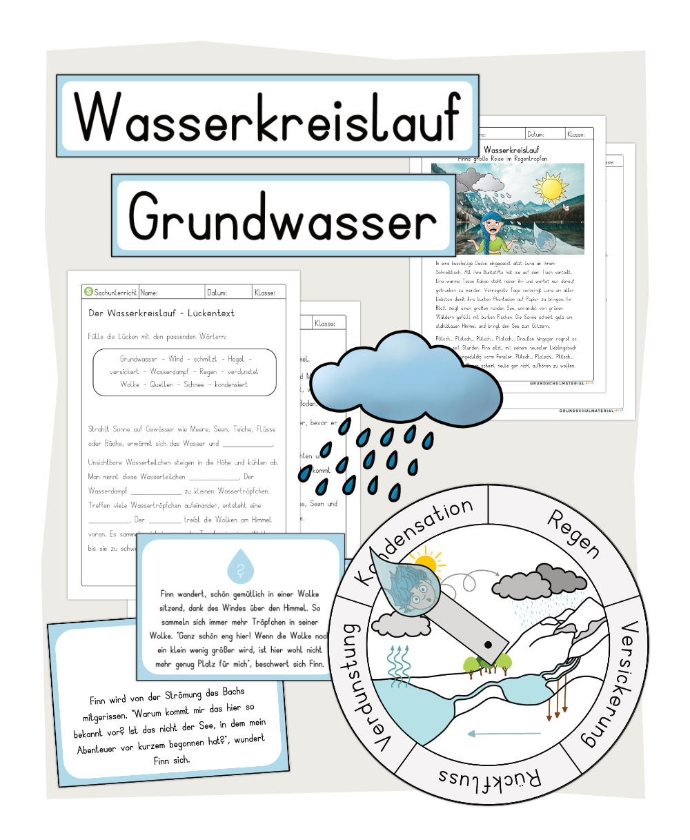 Das Thema Wasserkreislauf in der Grundschule lässt sich wunderbar praxisnah gestalten. Mit unserem Materialpaket "Wasserkreislauf" erhältst Du 18 Seiten zum Thema Wasserkreislauf, darin liebevoll gestaltete Arbeitsblätter und leicht verständliche Übungen für Deinen Sachkundeunterricht, mit denen du deinen Schülerinnen und Schülern unseren blauen Planeten spielerisch verständlich machen kannst.