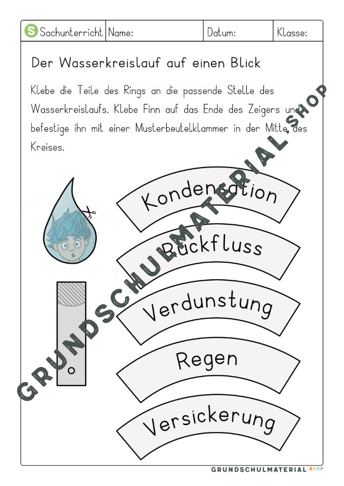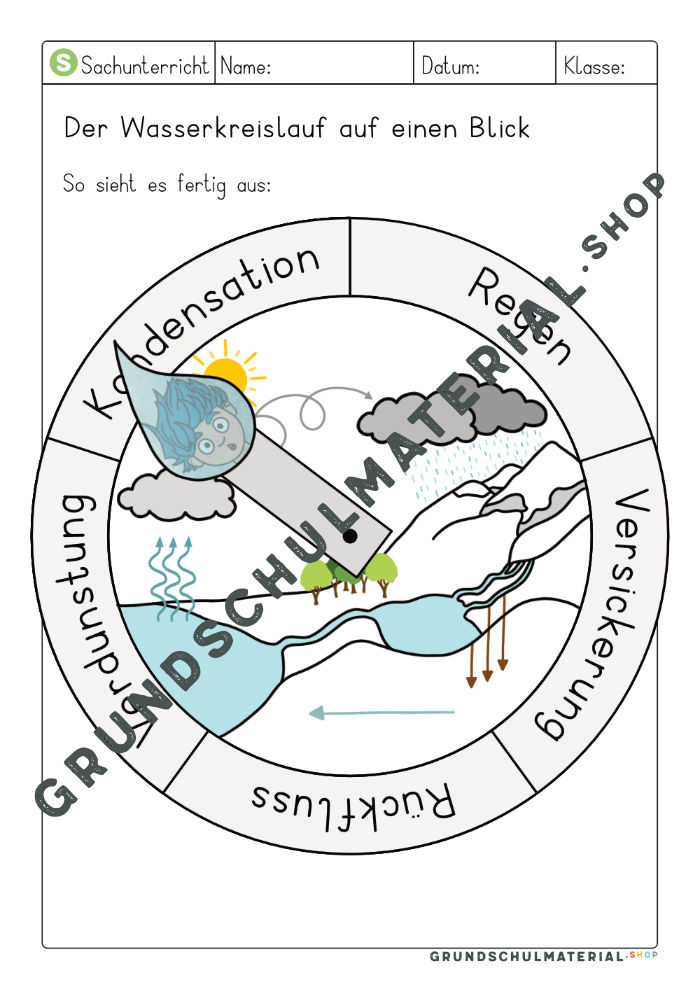Suchst Du nach einer kindgerechten Wasserkreislauf-Erklärung? Dann ist unser Wasserkreislauf Rad ideal für Deinen Grundschulunterricht! Jedes Kind kann für sich selbst den Wasserkreislauf visualisieren und so besser verinnerlichen. Dazu schneidet einfach die einzelnen Bestandteile auf dem Wasserkreislauf Arbeitsblatt aus und ordnet es auf dem Rad richtig an. Das bringt nicht nur Bastelspaß, sondern ist so auch jeder Schritt im Wasserkreislauf für Deine Schülerinnen sehr gut nachvollziehbar!