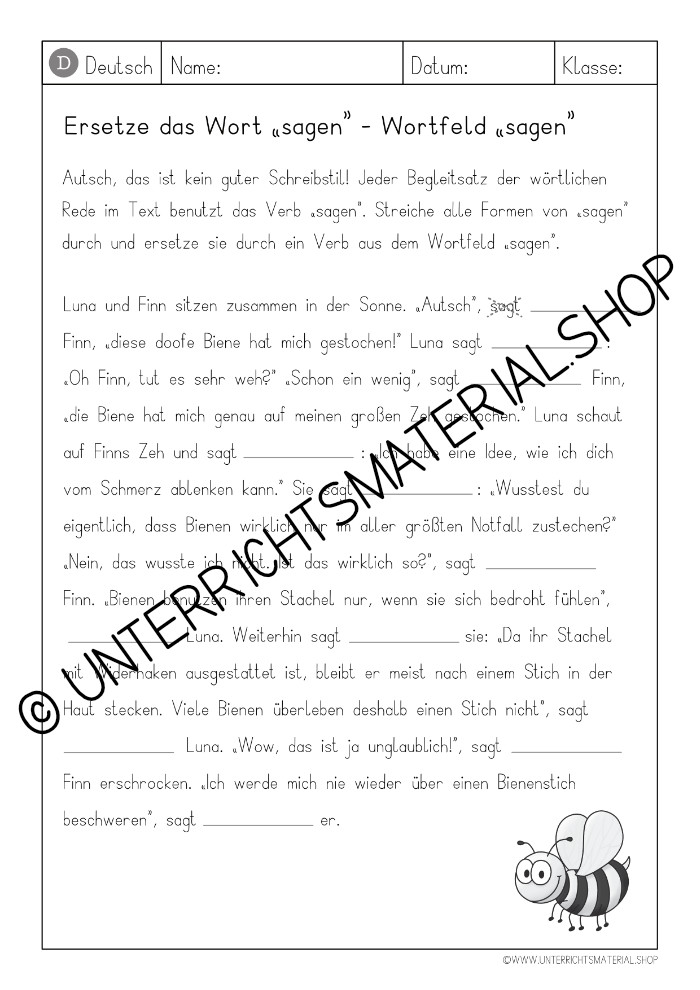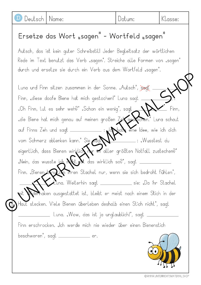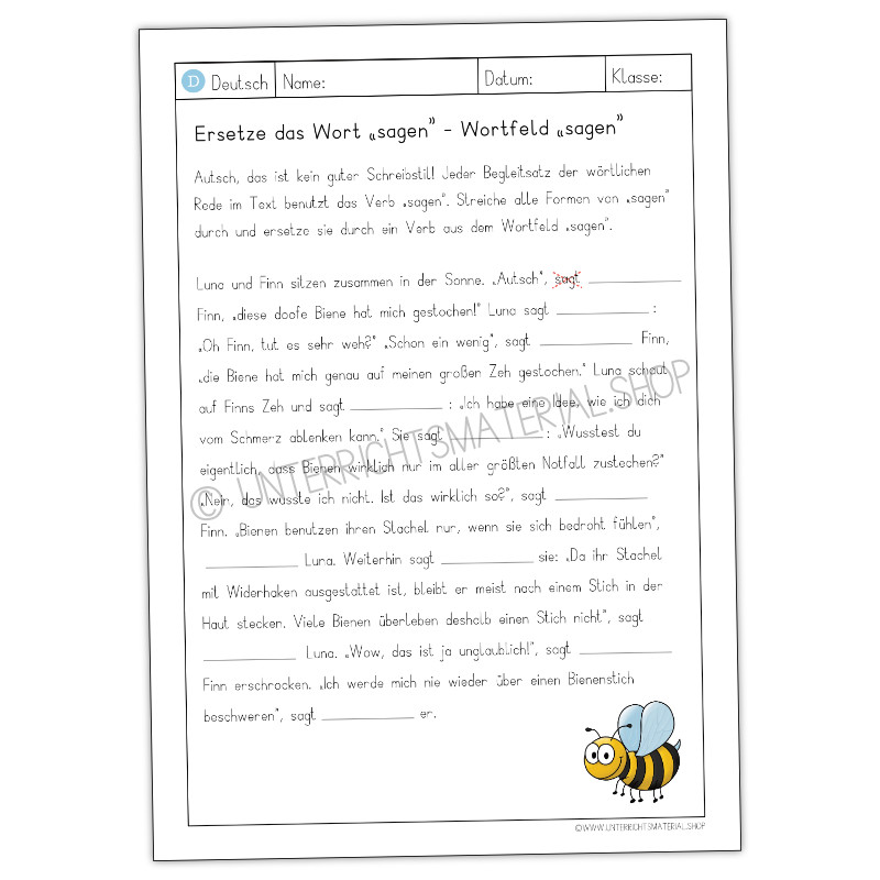 Dieses Arbeitsblatt zur wörtlichen Rede behandelt das Wortfeld „sagen“. Die Grundschüler üben die Verwendung anderer Wörter, um Wiederholungen zu vermeiden. Zudem drückt das Wort alleine keine Emotionen oder Situationen aus. Diese Übung hilft den Kindern ihren Begleitsatz individueller und lebendiger zu gestalten. Beispielsätze wie „Luna und Finn sitzen zusammen in der Sonne. „Autsch“, sagt Finn, „diese doofe Biene hat mich gestochen!““ zeigen ihnen das Problem. Finn hat sich erschrocken und aufgeschrien, das Wort „sagen“ reicht hier nicht aus. Die Schüler ermitteln welche Alternative aus dem Wortfeld besser passt. Nun streichen sie das falsche Wort durch und tragen das richtige in das Feld ein.