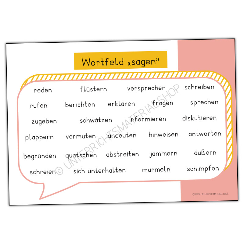 Diese Plakate zeigen den Grundschülern, Alternativen zum Wortfeld sagen. Mithilfe dieser Übung verfassen sie abwechslungsreichere Begleitsätze in wörtlichen Reden. Da sie oft dazu neigen, in Erzählungen und Geschichten das Wort „sagen“ zu Verwenden. Hilft ihnen dieses Plakat mit einer Vielzahl an Umschreibungen. Die Verwendung von reden, flüstern, versprechen, schreiben, rufen oder jammern macht eine direkte Rede aussagekräftiger. Je nach Emotion und Situation reicht „sagen“ nicht aus. Eine verspielte Aufmachung als bunte Sprechblase lenkt die Aufmerksamkeit der Kinder auf das Plakat. Es animiert sie zur Mitarbeit. Dieses Lehrmittel bietet eine Vielzahl an möglichen Übungen zum Schreiben und Verstehen an.